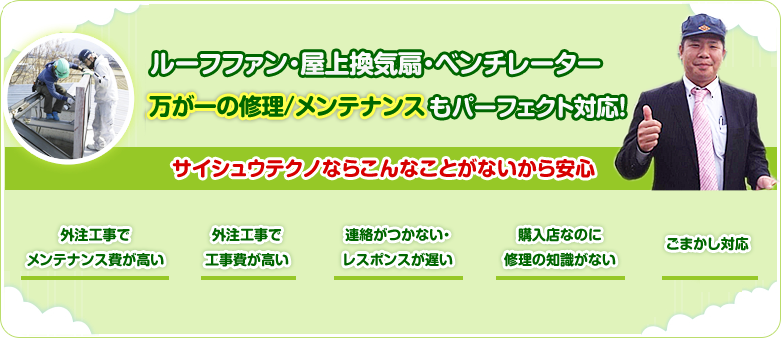 サイシュウテクノはルーフファン・屋上換気扇・ベンチレーターの専門会社だから、豊富なノウハウがあります。 販売から設置工事まで一貫対応で、修理やメンテナンスも施工内容・施工費用、すべての面でご安心いただけると自負しています。